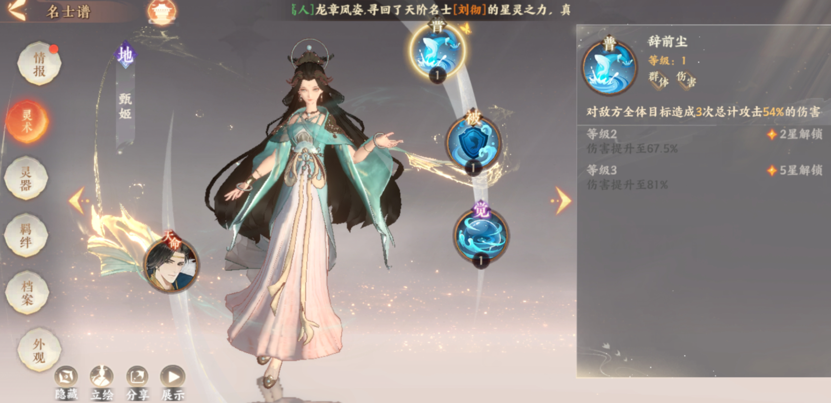 再来看看甄姬的各项技能,其一技能普通攻击——辞前尘:对敌方全体目标造成3次总计攻击54%的伤害,二技能被动技能——灵蛇照影:战斗开始时获得2层【照影】,其中【照影】:每层提升攻击5%,不可驱散,最高可叠加2层。三技能觉醒技能——觉醒·浮生惊梦:对敌方全体目标造成3次总计攻击108%的伤害,消耗1层【照影】。不得不说,虽然甄姬是一个输出定位,但是大面积的群攻伤害,即使对面是“铁打的身子”,恐怕也遭不住甄姬的“致命一击”。