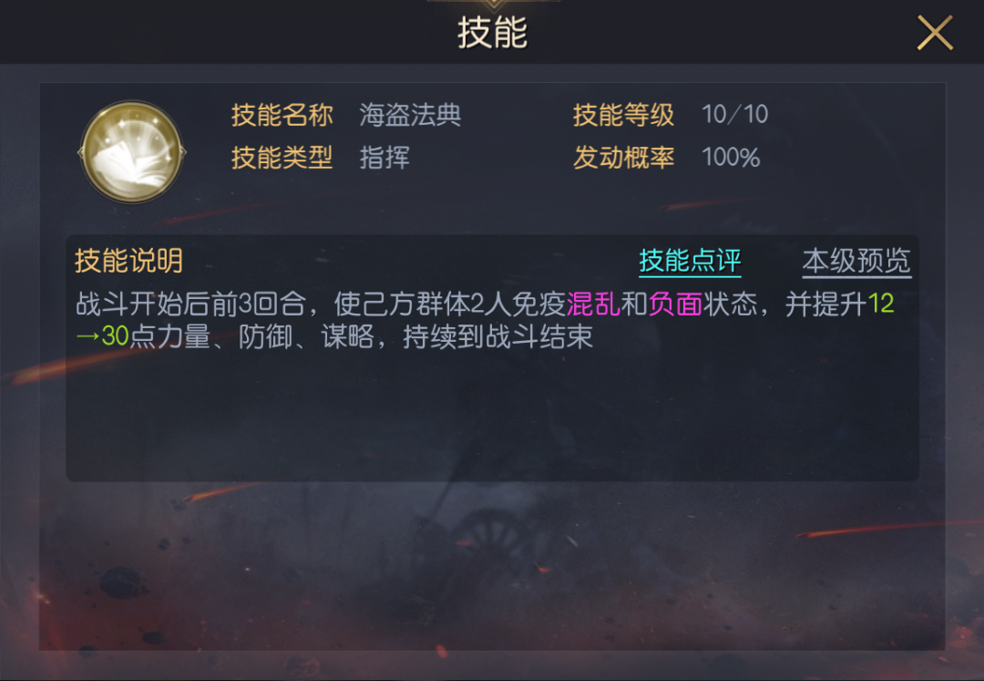 该技能的优势在于发动节点,会在准备回合发动,而不像其他指挥技能是行动后发动,所以必定可让队伍中的2人在前三回合免疫全部负面效果,容错率很高,特别对一些开局负面技能克制力很强,如罗马号角、红冠之蛇完全被克努特克制。