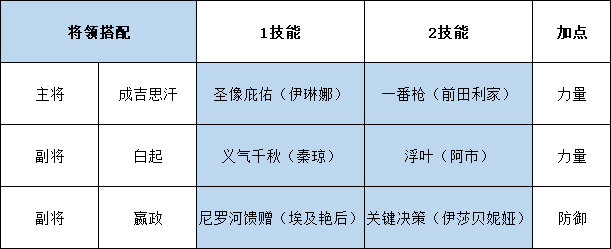 这是一个以嬴政为核心组建的阵容。该阵容中,嬴政为辅助位,携带的技能以保护己方、提高我方C位输出为主。主C位留给成吉思汗,成吉思汗前四回合需要抗住伤害,才能在低5回合之后发起爆发攻击。所以技能选择上以保命和输出为主。因为前期成吉思汗无法攻击,所以白起就要承担起副C的作用,技能选择上,兼具输出和防御。