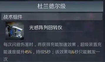 每次闪避伤害时,将获得充能加速效果,超级装置充能速度提升45%,持续5秒;该效果每6秒只能触发一次。特有加成: