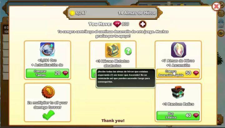 甚至连游戏的核心奖励机制,也只是几个以几何级数增长的数字。用代表金币的数字购买和升级英雄,换取代表DPS的数字,再用代表DPS的数字消灭代表怪物血量的数字。被消灭的血量数字又变成金币数字,重新回归这个循环。到后期,通过玩家不断地努力,终于取得了资格,得到一种代表“英魂”的新的高级数字。假如你愿意放弃之前所有的数字,这个高级数字就能在你的下一轮游戏中,让所有低级的数字变成更大的数字。