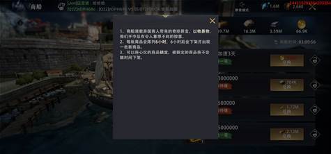 商船每批会陈列4笔交换物品,每批商品陈列6小时,6小时后会下架并出现一批新商品。心仪商品还可进行锁定,被锁定的商品不会随时间下架。