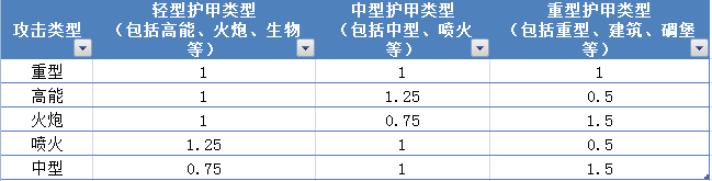数字为1表示二者之间无克制关系,不为1的则表现出了两种类型之间的克制关系。比如高能对中型护甲类坦克具有攻击加成效果,伤害可输出原来的1.25倍,却被重型护甲类型坦克克制,对它们只能造成自身一半的伤害。