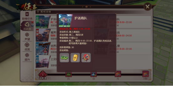 在周二周四晚上6点到10点的这四个小时。护送商队和劫持商队必做,每个活动可以做2次,小号可以多刷新一下找找有没有等级低的小号去选择挑战,这样下我们每个角色可平均收入20W6个号我们又有120W的收入