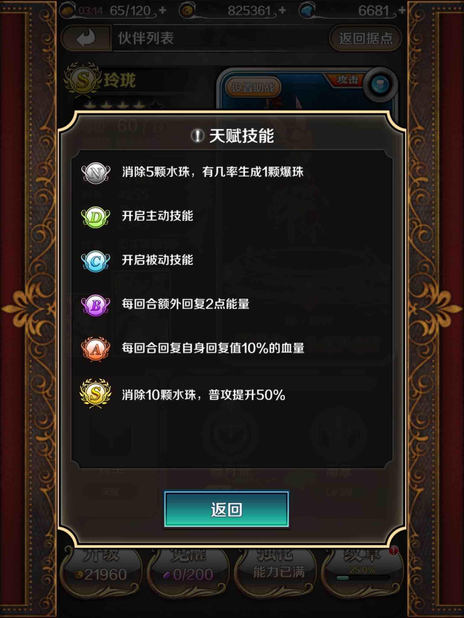 现在人手的玲珑基本三星,三星被动技能满是40 减少能量5点 进本的初始能量应该是25。所以水位上玲珑不能无脑连珠。进本第一回合不可以过多的练珠,以至于一回合解决完小怪。应该用两至三个回合的时间来给玲珑和其它角色加能量 和更多的屯克制boss属性的珠。水克火 火克风 风克地 地克水。