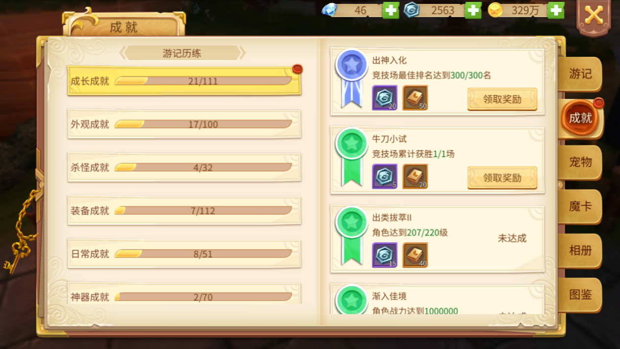 打开游记我们就可以看到游记里包含成就、宠物、魔卡……此类的诸多内容,我们可通过这些内容来获取阅历来对游记进行进阶,进阶后的游记不仅能够为我们提供战力上的提升,还会为我们提供丰厚的奖励内容哦!