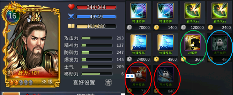 红圈必开技能,蓝圈有金可以选者,绿圈0氪选者