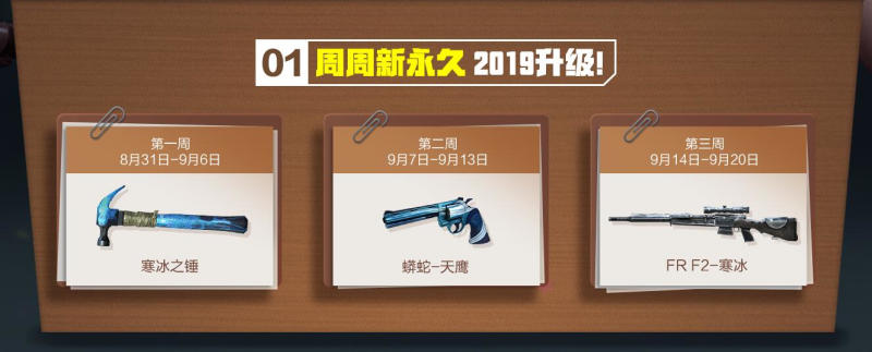 与此同时,周周新永久惊喜连环上线。8月31日至9月6日限定“寒冰之锤”,9月7日至9月13日限定“蟒蛇-天鹰”,9月14日至9月20日限定“FR F2-寒冰”,一如既往出色的武器属性,搭配超高武器颜值,相信会成为广大潮人的不二之选。