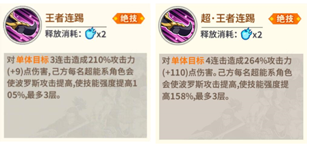 [超·王者连踢]在没有超能队友加持的情况下,其伤害倍率从3.15放大至4.22,加之三段攻击提升至四段,且暴击独立计算,可进一步放大其伤害量;在3名超能力队友的作用下,伤害倍率可增至7.38。且超能队友加持的伤害受暴击、崩坏等因素影响,进一步加强了波罗斯的伤害能力。