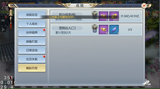 页面中对成就的分类非常详细,个人成长、伙伴培养、装备打造、日常活动、社交关系和精彩历程。其中个人成长、伙伴培养和装备打造都是需要使对应的项目达到相应的等级,进行角色的全面培养,这当然不是一朝一夕能做到的,需要小伙伴每日登陆通过任务来获得相应的材料。