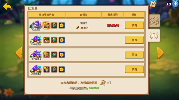 每个村庄内都有14个地块可供争夺占领,不同地块产出的英雄碎片也不同,可以选择你心仪的地块进行竞技争夺。每个玩家只能占领一个地块,如果需要占领或挑战另外一个地块,则需要撤离当前已占领的地块。
