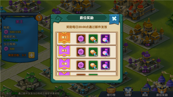 王城争霸是装备宝石的主要来源,包括普通宝石袋和高级宝石袋。奖励方式为税收奖励。爵位越高,每日获得的税收奖励也越多。从骑士到侯爵,每个爵位都分别有4个不同的城池可供挑战,同级爵位的不同城池所产生的税收奖励也不相同。