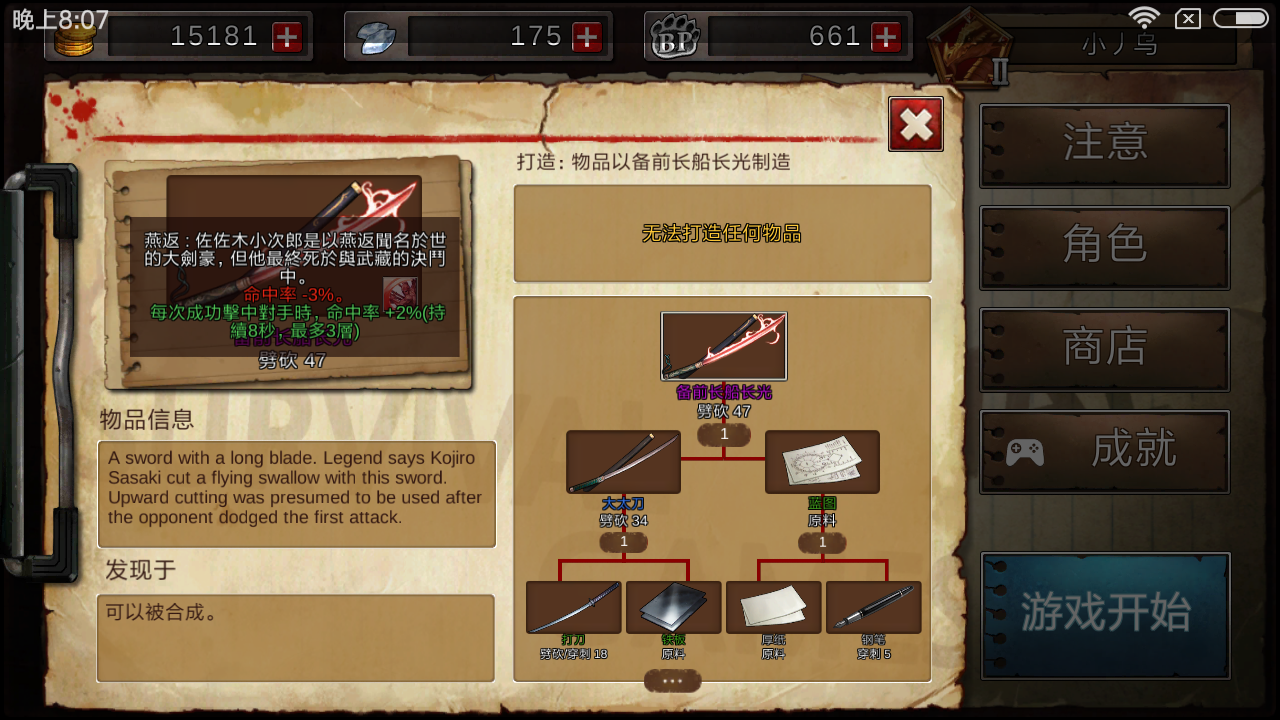 刀剑易损易坏所以切记不要过分早的制作紫武,当然武器也会钝化(武器面板现实47-1)可以用拿到的磨刀石使用(对,可以使用,不是合成)来去除钝化的减益。