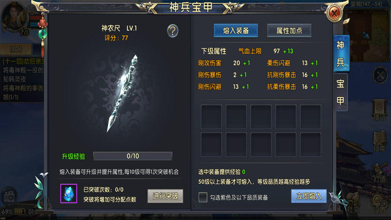 还在为属性提升遇到瓶颈而烦恼吗,全新的神兵宝甲系统即将到来,玩家可以手持神农尺神兵,身上装备鹤壁宝甲,可谓无坚不摧仿佛诸邪不侵。玩家可以将平时任务或者副本中获得的多余装备溶入到神兵中,帮助神兵进行等级提升。神兵在达到一定等级后可以进行突破,同时获得可自由分配的属性点。