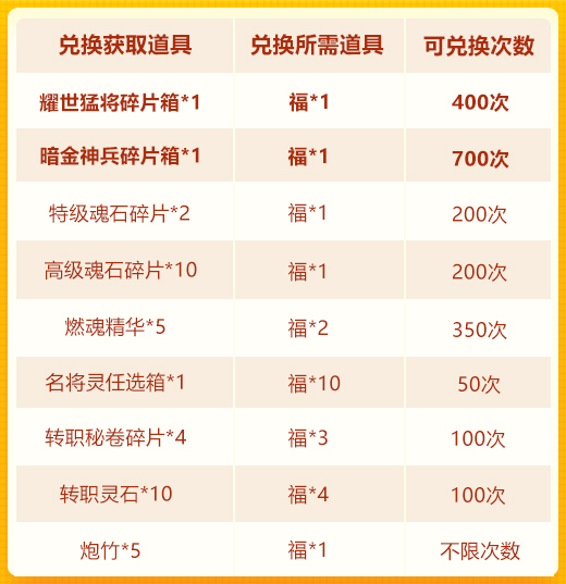 「福」可兑换耀世猛将碎片箱、暗金神兵碎片箱、名将灵转职燃魂包等资源: