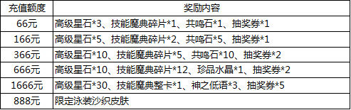 如果充值满1666元,除钻石外总共可以获得高级星石*58、技能魔典碎片*20、技能魔典1本、共鸣石*16、珍品水晶*1、神之低语*3、外加11张抽奖券的额外奖励!
