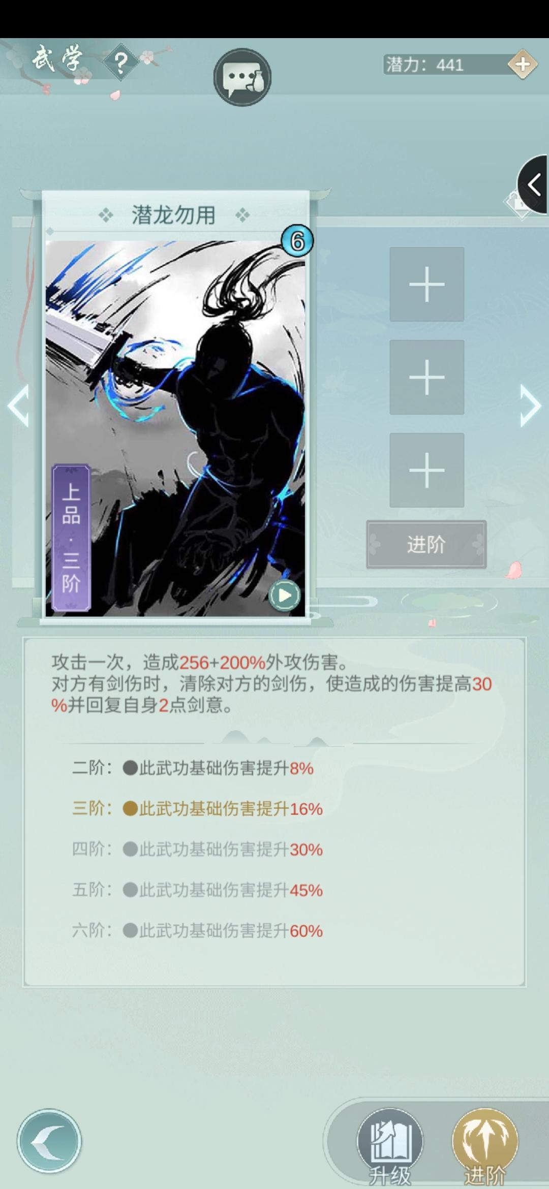 潜龙勿用,更是简单粗暴武学,有一点要说的是剑斩暴击后给敌人提供的debuff可以直接为潜龙勿用提供30%的增伤害。