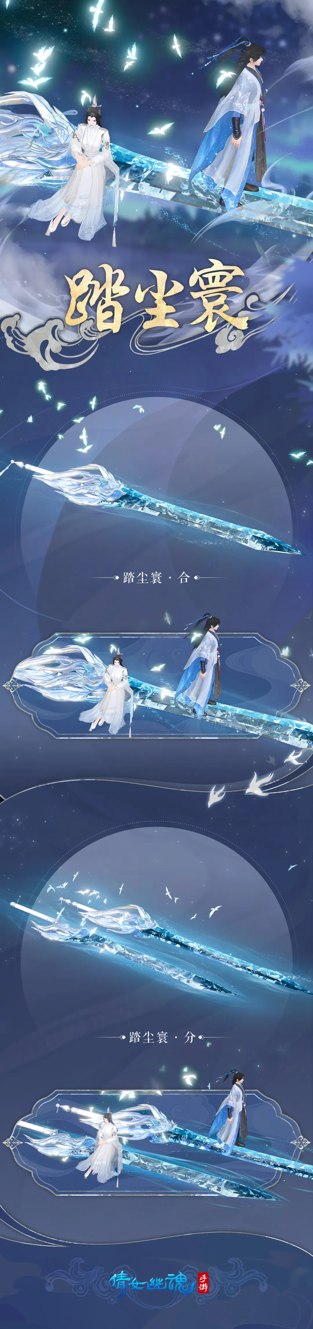 踏尘寰坐骑首次采用了分离式设计,在飞行过程中会形态会周期变化分合,从一柄巨剑变为两柄稍细的长剑。
