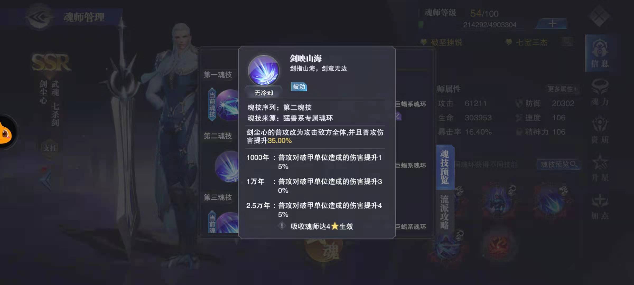 猛兽系2技能:群体普攻,对破甲单位提升额外伤害,朴实无华看着很帅,开服推图可以用,或者就是针对限时巅峰0消耗魂力的排名时候可以用尘心带猛兽2技能一下下的平A磨过去,但是回合数会很长。