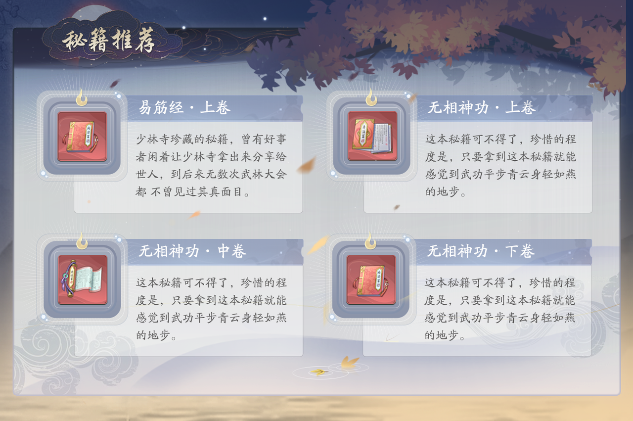 在秘籍上,小二推荐优先无相神功。作为防御辅助型前排,无相神功的秘技能保证少林开出绝技,增加队伍容错率了啦。如果没有无相神功的话,洗髓经的防御属性对于少林来说也不错。
