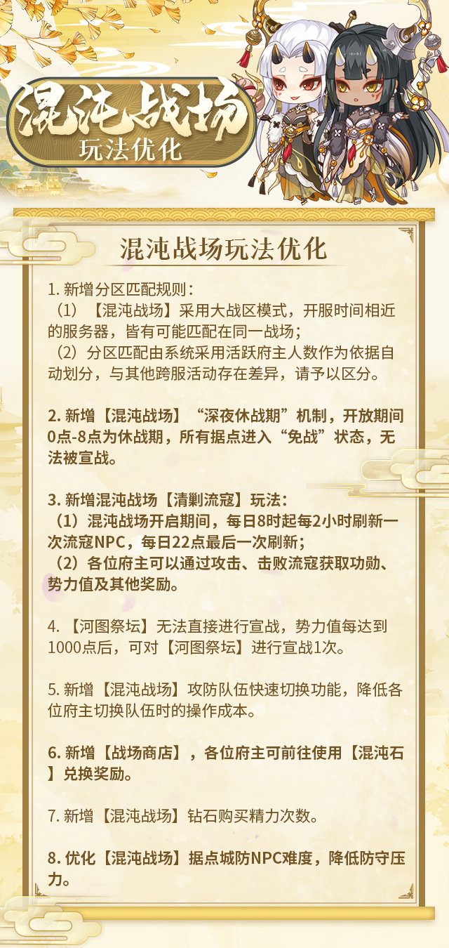 前两个赛季之后有府主大人反馈战场上内卷压力太大,在战场上的生存空间太小,没法拿到比较好的战场资源等。所以本次更新混沌战场优化新增了一项友好的功能——清流剿匪