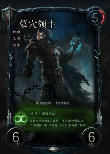 这边想可以谈一下我对高级生物的见解,人类这边拥有的高级生物是督军、统帅和二甲哥充当的作用是过牌,贴buff和防守;亡灵的高级生物是食尸鬼、过牌法师、复活法师和墓穴领主充当的作用是润滑卡组,过牌,铺场和进攻;精灵的高级生物是圣林守林人和暗面妨碍者充当作用是贴debuff和控制场面;恶魔的高级生物则基本都是优质身材的进攻卡。高级卡基本处于润滑卡组和控场的作用,这个时候高级生物就不存在是否亏模的状态而是是否能够发挥作用以及可以发挥作用的次数,其中表现最明显的就是精灵两个高级生物的combo了,贴标减攻,下场就能滚雪球的1000%好卡。另一个方面则是具备优质身材的负责进攻和防守的高级生物,常见于恶魔,不过目前恶魔能够贴部队的只有一个祭品车不属于战斗单位,所以可理解为恶魔只有高级卡,都是带粉碎的高身材大哥,除了吃祭品外无缺点,前中后都是猛男,不过目前恶魔最大的问题也是猛了之后却缺乏把雪球滚起来的能力,因此中后期明显乏力。所以我们看亡灵的墓穴领主,触发效果5费9-9带粉碎,对比人类5费7-7的银晖和4费4-5粉碎哥,起码超模了2费,并且身材正面,下场就能改变亡灵一地杂毛的劣势,真正的亡灵英雄(误)。