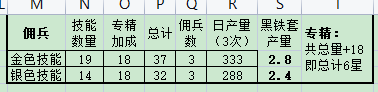 大师6小时一次。一天按收菜3次,技能满级,专精共6星算,即产量+18。产量如上图,各3个佣兵即可生产2-3套黑铁套,满足佛系玩家日常的装备消耗了。