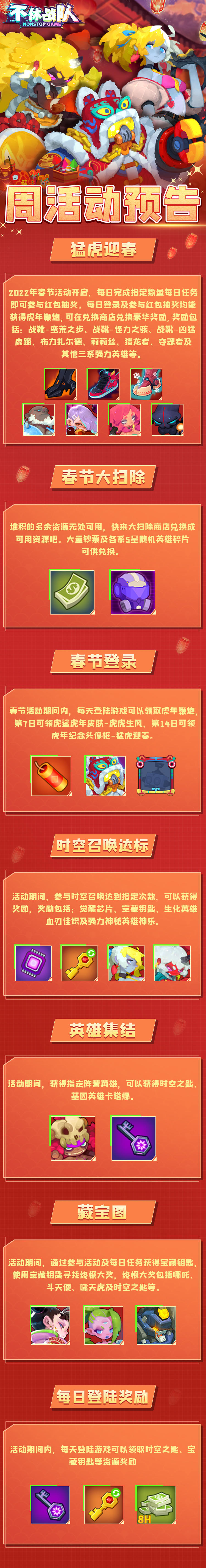 ①猛虎迎春:2022年春节活动开启,每日完成指定数量每日任务即可参与红包抽奖。每日登录及参与红包抽奖均能获得虎年鞭炮,可在兑换商店兑换豪华奖励,奖励包括:战靴-蛮荒之步、战靴-怪力之骇、战靴-凶猛鹿蹄、布力扎尔德、莉莉丝、猎龙者、夺魂者及其他三系强力英雄等。