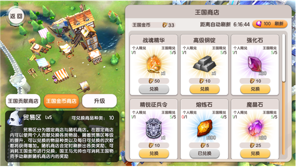 贡献商店是个人兑换,可以使用签到和完成王国任务所获得的王国贡献兑换物品,商店可以兑换的物品每日是固定的,并且随着贸易区的等级提升,也会增加兑换物品和兑换的数量