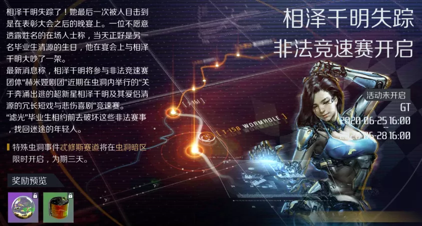 最新消息称,相泽干明将参与非法竞速赛团体“赫米娅剧团”近期在虫洞内举行的“关于奔涌出逃的超新星相泽干明及其爱侣清源的冗长短戏与悲伤喜剧”竞速赛。