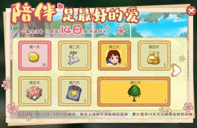为了感谢村民们一年以来不离不弃的陪伴,村委会为大家准备了14日登录好礼~活动期间,村民们每日上线就可领取对应天数的奖励,累计登录14天就可以获得全部奖励哦!不仅有一周年限定头像、星月树,还有樱花季主题道具樱语·鹿鸣、樱见·电视柜和樱语·祈樱华!谁能拒绝落英缤纷的巨大樱花树呢?