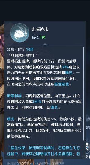 解析:光盾追击是一个非常长的位移,还可以控制自身位移距离,用的好就是神技能,用不好就会位移远一点或近一点,效果就差了些,所以需要冒险家们多多练习,除此之外,这个特技还会叠加曝光属性效果,非常的nice。