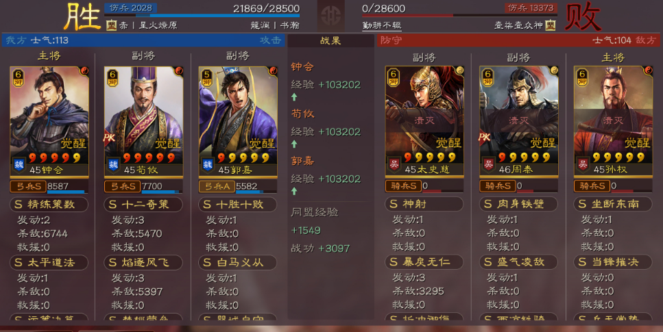 首战遇到孙太周的吴骑,钟会和荀攸的输出还是相当给力的,关键的是他俩的战法一旦触发,拥有缴械和震慑的效果,把对手的普攻限制的死死的,最终7000战损打穿对手!