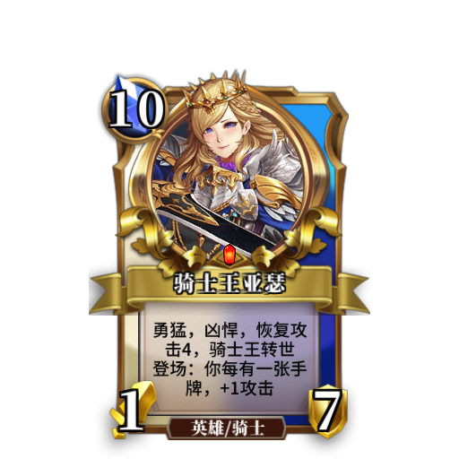 以下卡牌只能通过宝具获得,且无法在游戏中构筑这是穿戴转生防具 正义的亚瑟,英雄卡战败时可获得的骑士王元神,骑士王元神依附的生物战败时可将“正义·亚瑟”和“骑士王亚瑟”其中之一随机洗入牌库(随着版本轮替将来还会增加更多骑士王形态):
