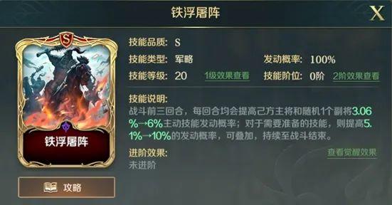 此技能作为军略技能,可以为主将增加主动技能发动概率,队伍中的主动技能发动概率较低,【铁浮屠阵】配合织田信长的决胜效果,可以提高织田信长输出的稳定性。