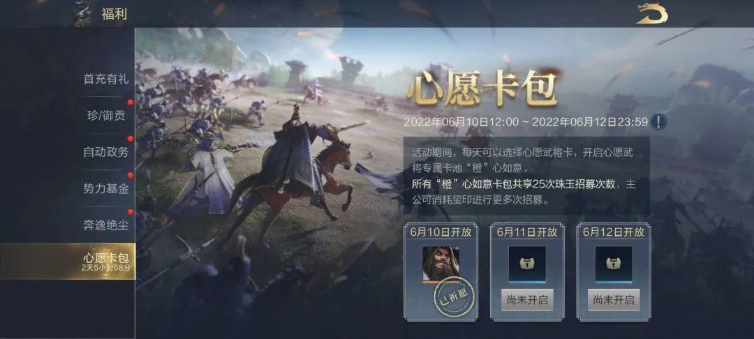 如今主公们将有机会凭借自己的求贤之心,许下心愿得武将临门。是否能够得偿所愿,为自己增添臂膀,且看明日——6月10日,心愿卡包活动将启,橙卡武将许愿即可获取!