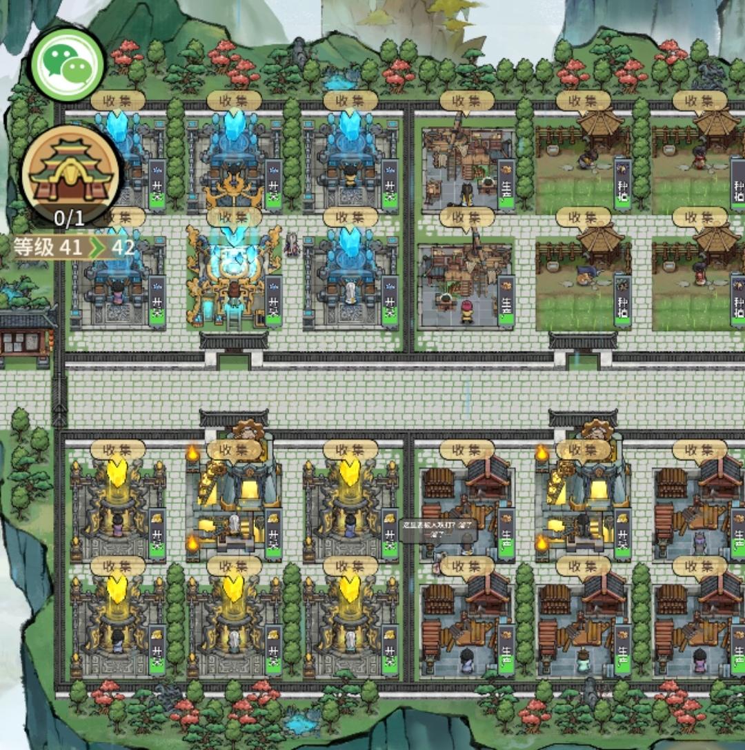 【主城区】接着是门派功能区,传功和功法在进门的下侧,上半部为四个炼制房和擂台,旁边配一个公告板意味着排行榜,中间矗立一座通天塔(也可以选择护山大剑),不要在门派内布置过多的装饰,全部铺大路显得高端大气,绿植分布在围墙外才是仙家大门的气派。