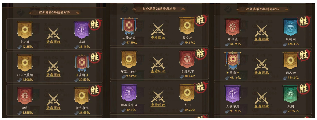 每次群英争霸赛中,都有以少胜多的精彩对决,本次积分赛第4场的【夜倾城】以60亿胜【一夜暴富】106亿。同样第8场【桃源】以9亿击败【粥可温】18亿。这两场战斗大同小异,都是主力门客过高且人员不足,导致显示的有点虚高,可见活跃的商会成员非常重要。