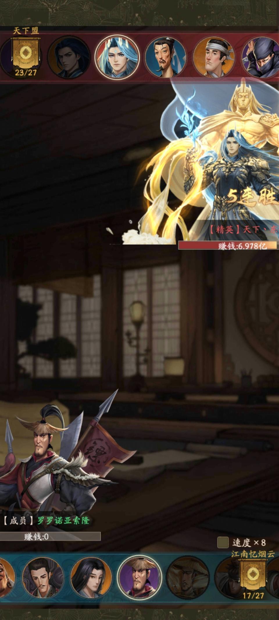决赛的第四天【汴梁创业联盟】和【战天下】也是派出了自身最强的门客进行pk,由于【汴梁创业联盟】在上一轮对战【常青藤联会】消耗了一波,在门客数量和赚速上都不敌【战天下】,最终惜败。
