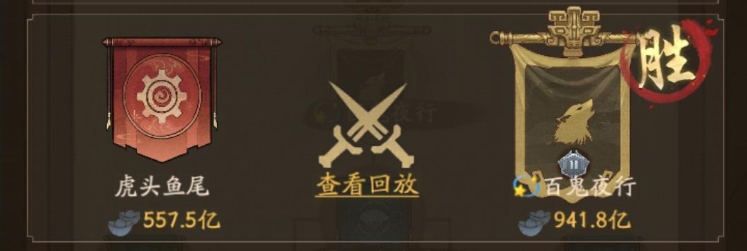 对局之前的银两募资【百鬼夜行】直接拉到了406.1亿亿,赢下了战力加成Buff。对局开始,【虎头鱼尾】一方会长和副会长职位上的鱼肉丸子和大鱿鱼直接高战力出击,打出一波9连胜,【百鬼夜行】一方立马回击,精英职位上的青行灯单人打出10连胜的完美发挥,中期的青鹭火和玉藻前也分别打出8连胜,直接清场了虎头鱼尾的主要战力,即使【虎头鱼尾】一方北极贝后续打出101亿的高额伤害也并没能扭转局势,后续【百鬼夜行】也是顺利赢下。