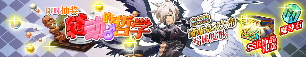 活动期间,消费一定的圣魔晶,赢取福利大奖。往期哲学皮肤限时复刻,大奖为包含SSR英雄洛维奈尔大帝限定皮肤「宵影使徒」在内的6选1皮肤礼包!