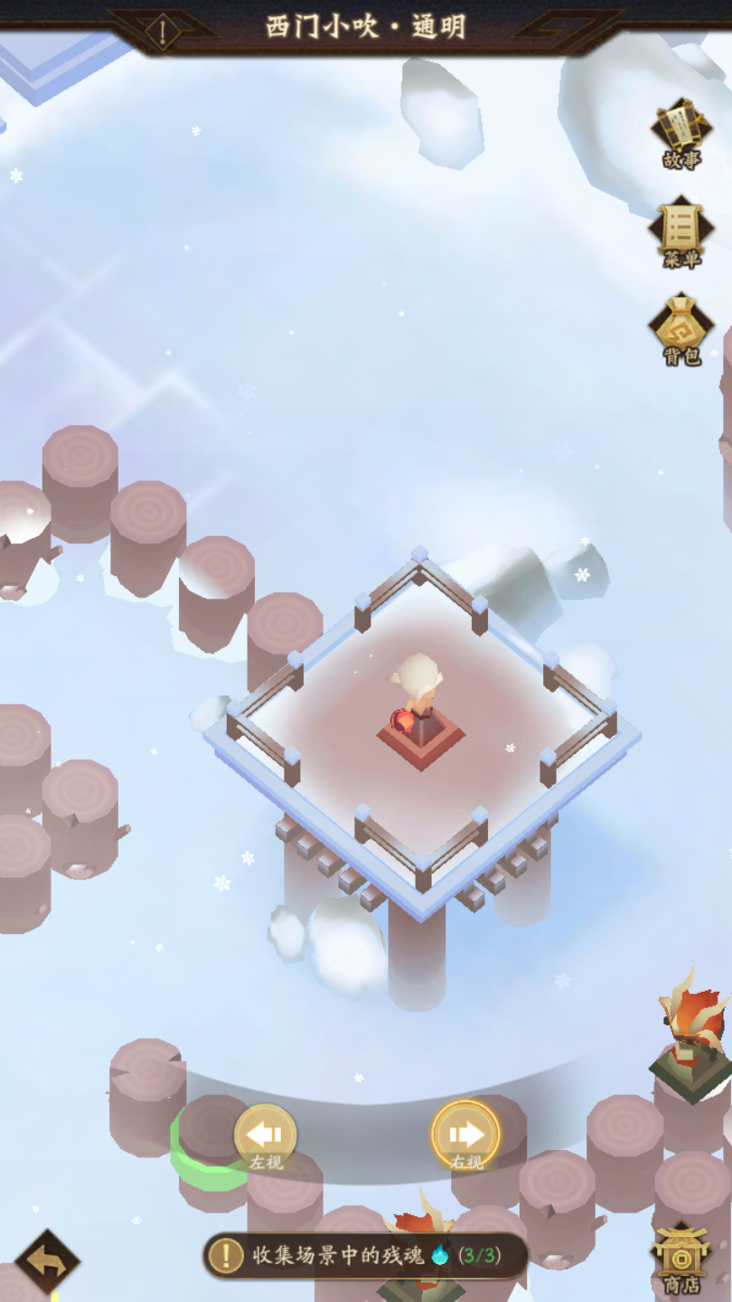 8.然后把视角改为右视,去往左边的路,清理小怪后,来到路的尽头。此时要让蓝柱子是升高的状态,如果不是,就回去踩一踩绿色的柱子。
