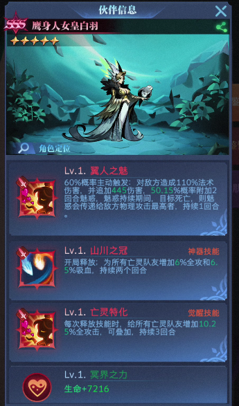 核心辅助技能:山河之冠(神器技能)+亡灵特化(觉醒技能),白羽在过图中,大概率是可以放出1-2技能的,给亡灵队友叠加接近100%的攻击,问题不大。
