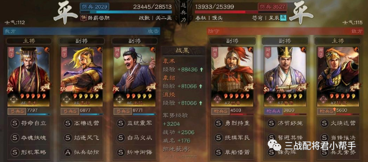 (主将)袁术,战法搭配:夺魂挟魄+形机军略 兵书选择——蛮勇非勇+执锐+文韬 (副将)SP袁绍,战法搭配:焰逐风飞+纵兵劫掠 兵书选择——临敌不乱+速战+驰援 (副将)沮授,战法搭配:白马义从+折冲御侮 兵书选择——奇正相生+藏刀+分险 接下来上实战对抗战报: 弓兵内战,打高红虎臣弓胜率很高,战损方面就主要看两边的发挥了。