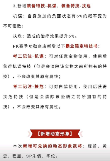 三国志战略版新版本的更新里,主要有两个方面的改动:一个是新增了程普、黄忠、程昱、SP朱儁、华佗的动态形象武将,武将多的玩家赶紧加红度吧!第二个则是最为重要的霸业限定特技书,也就是可对任意宝物使用以及可对白鹄使用,使用的扶危特技!对于满红大佬或者装备特技比较齐全的大佬玩家来说,又是一种强度的提升,平民玩家由于武将和宝物相对比较稀缺,并不一定能带来多少提升!