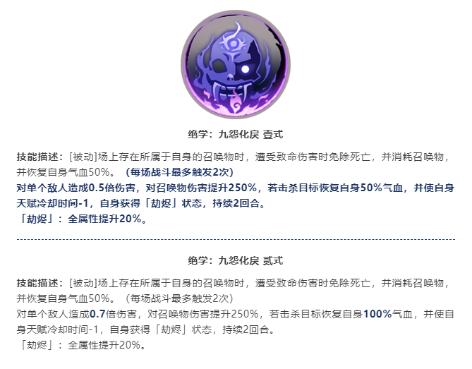 最后【九怨化戾】这个技能也可能让郸阴不仅能身背宝宝召唤者的美名,同时还能兼具宝宝大杀器的身份,而在PVP中随着目前宝宝召唤类英灵的增多,未来郸阴到底能起到多大的解药特性其实目前真的很难说,只能讲他至少可以在3C技能的支撑下,多给官方留一份情面吧......简而言之其搅屎棍特点或许会有更好的发挥。