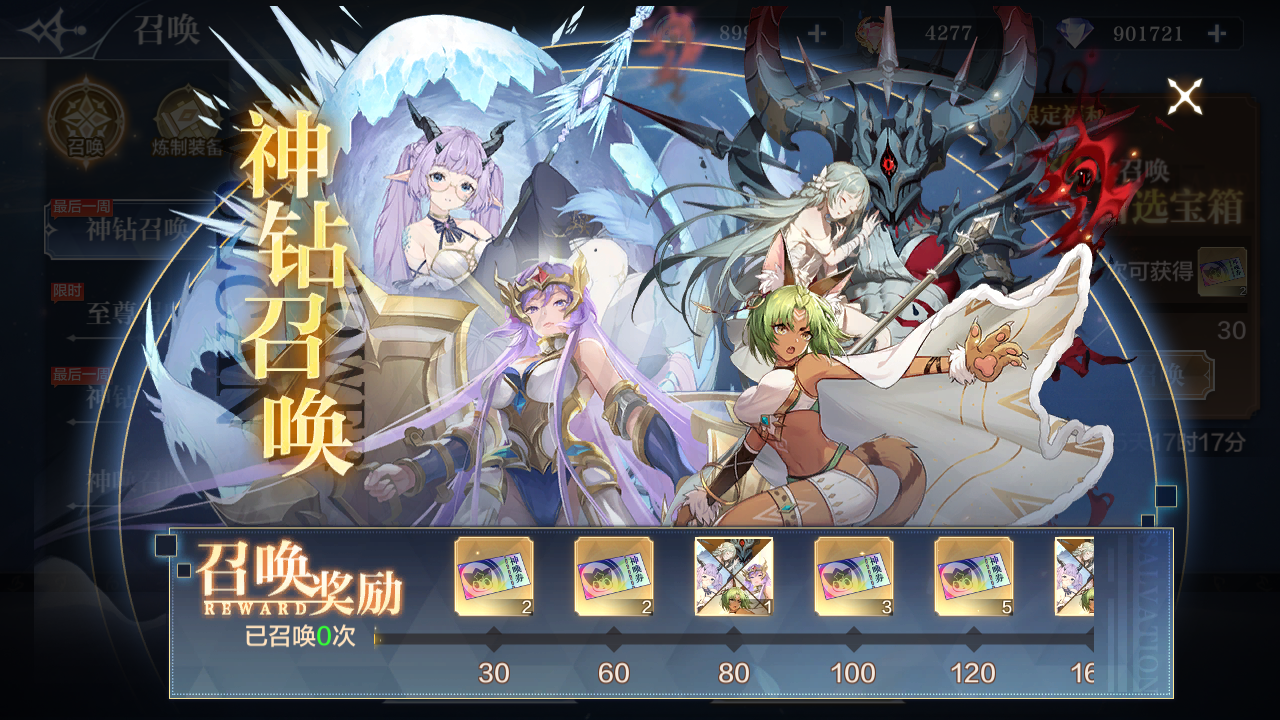 累计召唤160、240、320、400次:精灵自选箱*1(飒影猎手·辛西娅、胜利女神·雅典娜、龙女·耶梦加得、无间魔焰·瞳)
