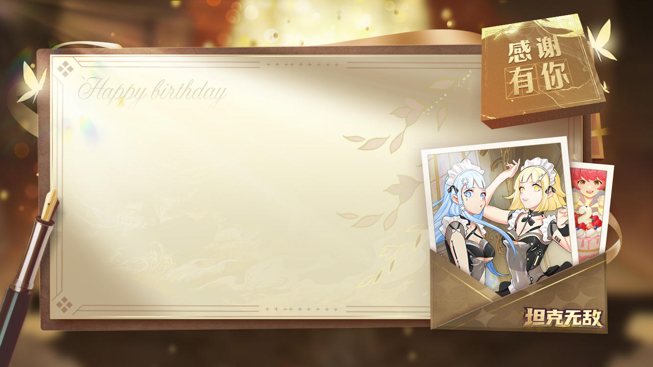 指挥官可以保存下方的“周年祝福贺卡”样式图,留言写下过往两年里在坦克无敌的美好点滴事件/周年祝福语/DIY手绘表情包/绘画等等均可,将制作好的“周年祝福贺卡”回复到本活动贴下方,并带上本人游戏内ID 和#坦克无敌二周年# 话题,即可视为成功投稿参与本次活动。
