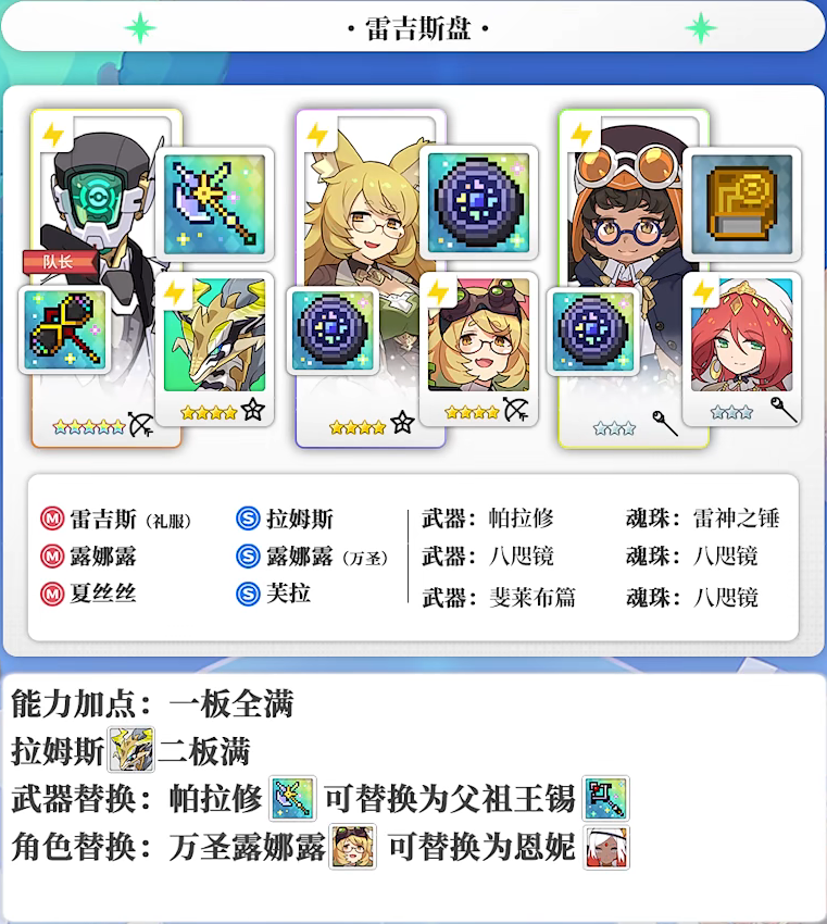 铃铛配队仍旧需要注意开局满充不卡c以及注意携带驱散和生存角色的问题,由于玩家们刚刚获得阿比斯斧,同时水荒龙boss的机制问题,本次活动推荐使用各种雷背水进行攻略,礼机则是由于副本的fever条变长被迫下岗,如果只有礼机队伍的小伙伴可能需要队友互相配合组队,分工合作完成拉fever条、输出和生存等任务