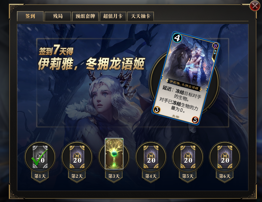 所有玩家登录都可直接领取10卡包,签到七天再送100卡包及传奇卡【伊莉雅,冬拥龙语姬】,新手不愁没卡,轻松尝试各种套路!更有专属稀有卡背免费领取,尽显独一无二的牌神气质!
